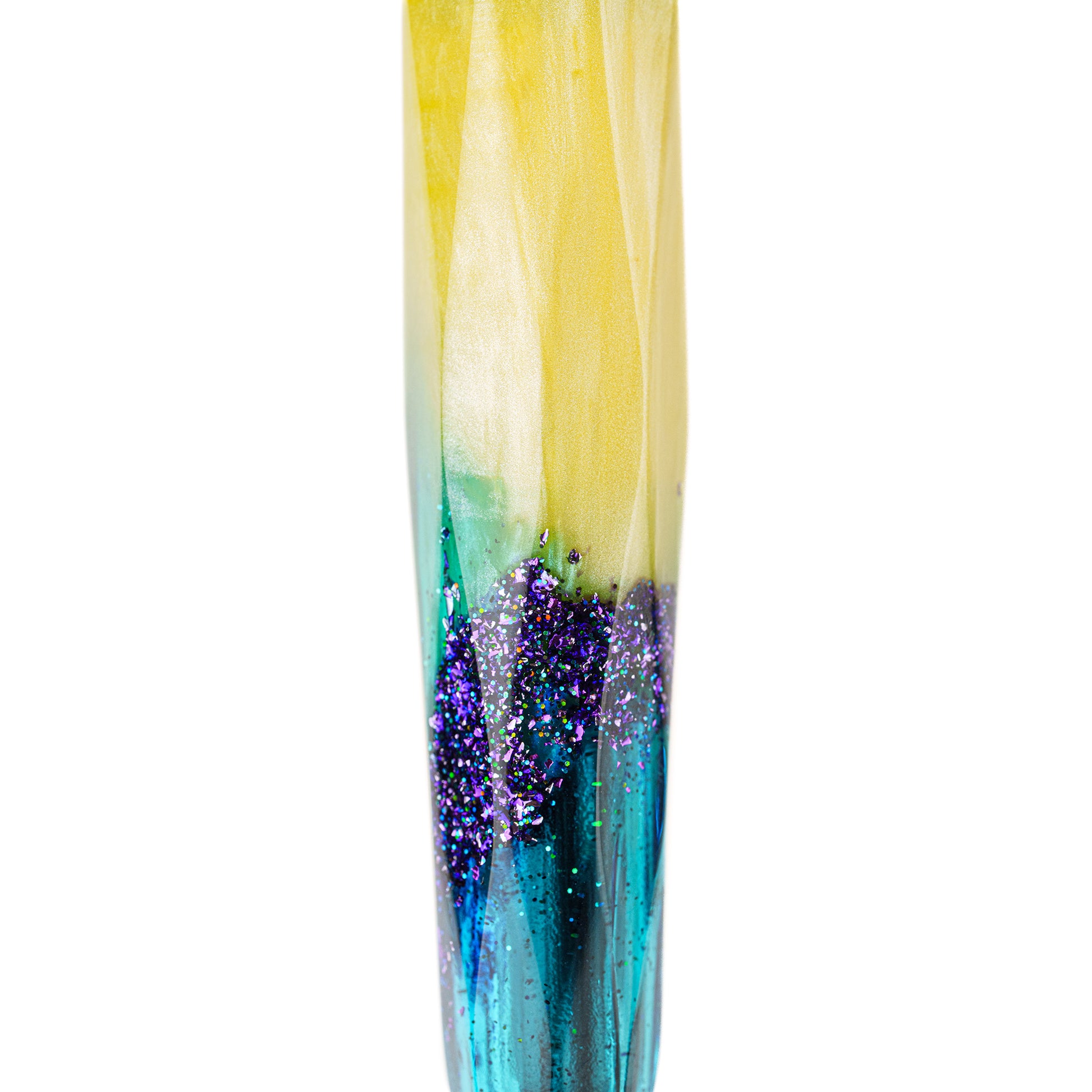 Tropicana, a vibrant new addition to our Briolette collection, is a celebration of colour and light. This pen showcases a vivid array of tropical greens and sunny yellows, seamlessly blending into a cool transparent turquoise. The pen's surface is adorned with sparkles resembling twinkling stars in a tropical sky. Tropicana pen captures the essence of lush, verdant landscapes and the exuberance of a tropical paradise. Its unique colour palette and dazzling accents make it a refreshing and standout piece in any pen collection.