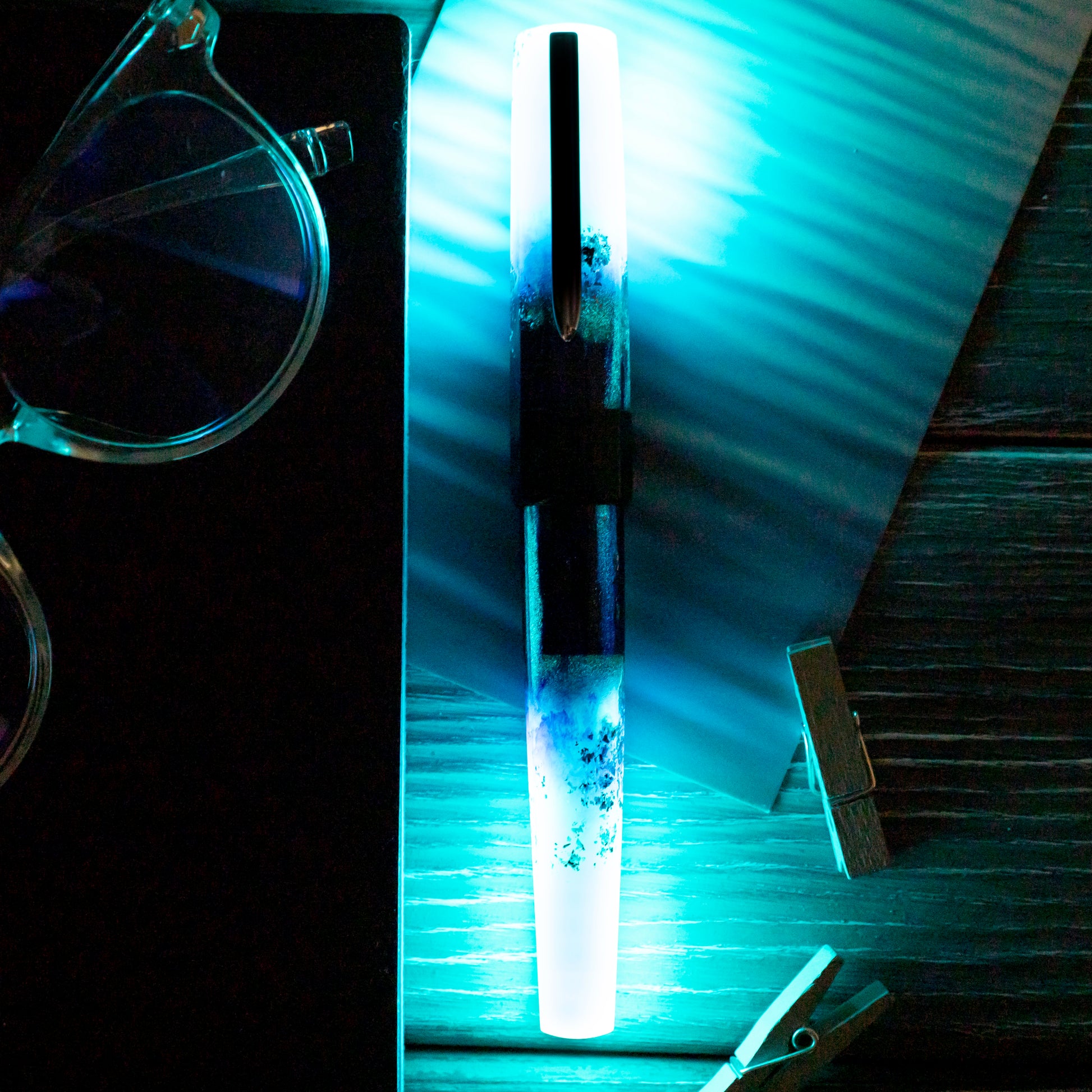 This pen glows beautifully in a dark and semi-dark with a blue green colour after an hour exposure to light. Please accept variations in duration of glowing depending on exposure time to light, and the intensity of the light source. There are different light sources you can use for 'charging' the pen to glow - natural sunlight, regular desk lamps, or LED lamps. Usually, LED lights produce a weaker glow compared to sunlight and traditional incandescent bulbs. However, avoid overheating especially when using incandescent lights and direct sunlight during 'charging'. Long exposure to warm sources with strong overheating (over 50°C / 122°F) can degrade the quality of the resin.