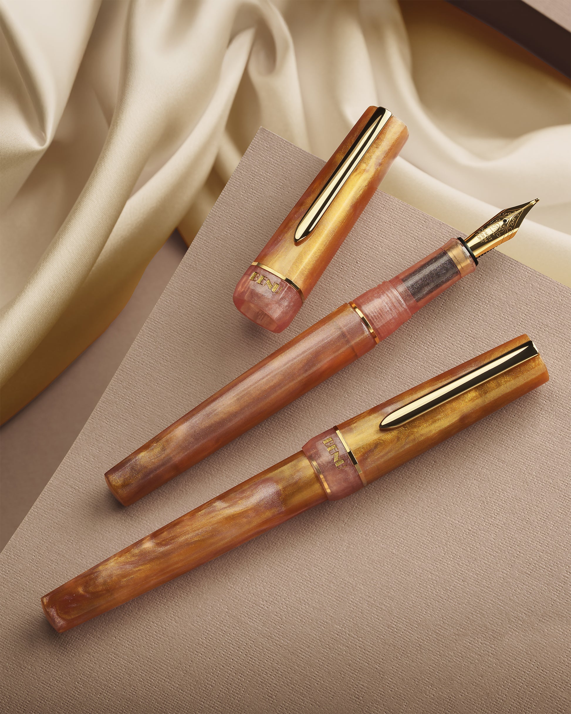 Lustre pen glows with warm swirls of amber and blush, finished in radiant gold trim. Quietly luxurious, Lustre brings refined charm to any writing ritual.