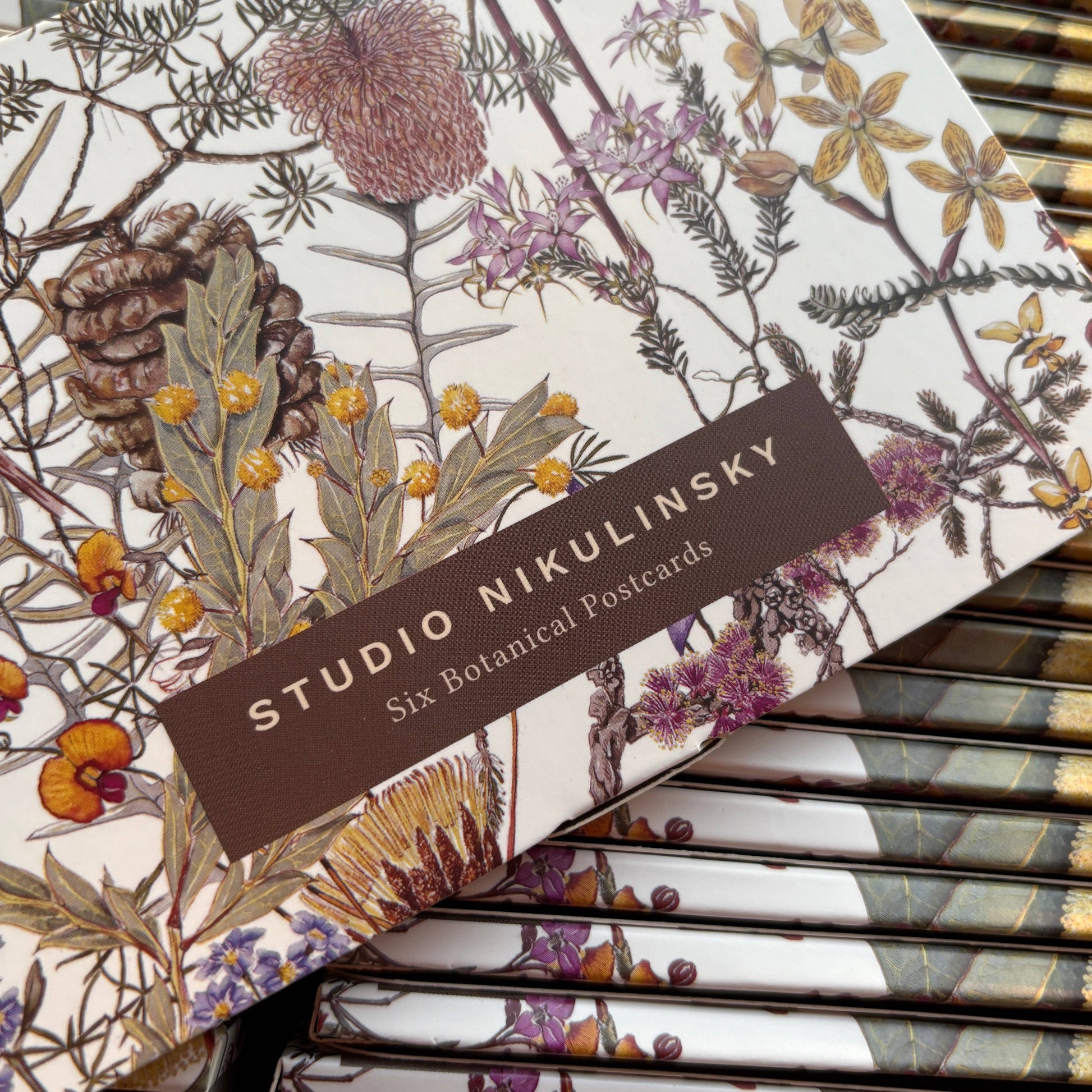 Six A5 postcards with botanical artworks by Philippa Nikulinsky.