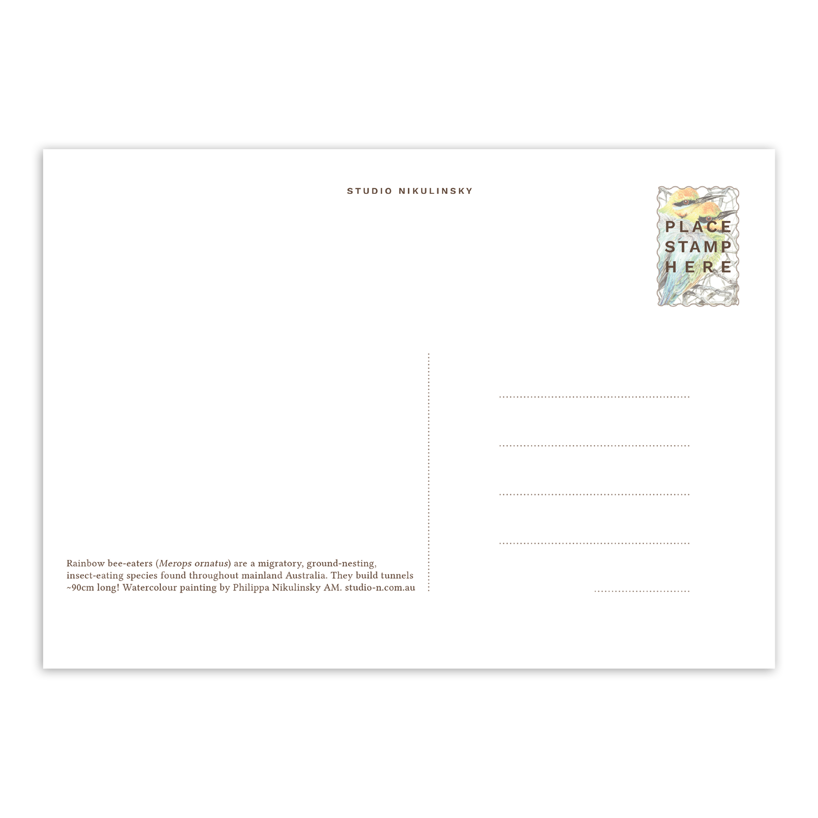 This Australian fauna postcard features a painting of Rainbow Bee Eaters by Philippa Nikulinsky.